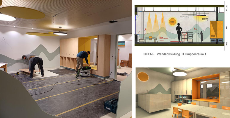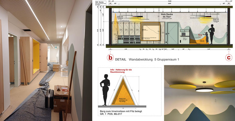 Die größte gestalterische Herausforderung im Hanggeschoss war, eine inspirierende Atmosphäre zu schaffen und den Kindern trotz der Lage eine Verbindung zur Natur zu ermöglichen. Unsere Antwort ist die spielerische Bergkulisse, die die Wände zum Leben erweckt. Durch den Einsatz von präzise geschnittenen MDF-Platten wurden plastische, dreidimensionale Berge modelliert und liebevoll bemalt. Diese Installation schafft einen tiefen kulissenartigen Effekt. Die Gruppenräume werden so in eine fantasievolle Landschaft verwandelt, die zum Klettern, Verstecken und Geschichtenerzählen anregt und den direkten Zugang zum Garten optisch fortsetzt. Die Kinder sind nun nicht nur im Raum, sondern mittendrin in ihrem Abenteuer „Bergwelt“.