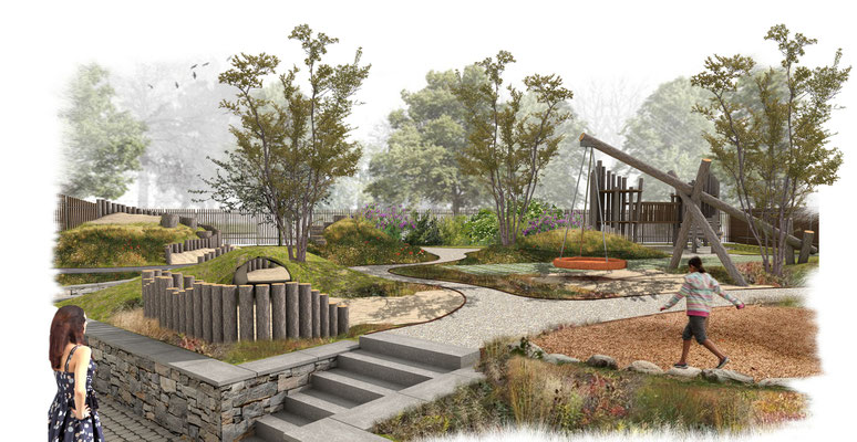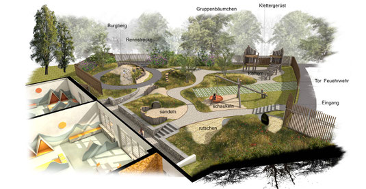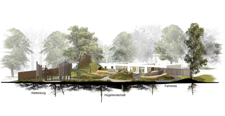 Durch die Modellierung des Geländes entstehen kleine Hügel und Senken, die die Formensprache der Berge aufgreifen. Diese modellierte Spiellandschaft aus Erde, Holz und Naturmaterialien wird zur Mini-Bergwelt. Hier können die Kinder klettern, balancieren und die Natur erleben. Die fließenden Übergänge zwischen drinnen und draußen schaffen so eine ganzheitliche Spielumgebung, in der das Abenteuer Berg immer präsent ist.