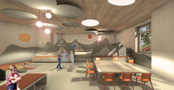 Der sanierte Kindergarten in Trossingen ist ein Ort, der höchste Anforderungen an Lärmschutz, die Simulation von Tageslicht und Gestaltung erfüllt. Unter dem Titel „Auf in die Berge“ bietet er den Kindern eine fantasievolle, gesunde und zukunftsorientierte Umgebung für ihre ersten wichtigen Lebensjahre.