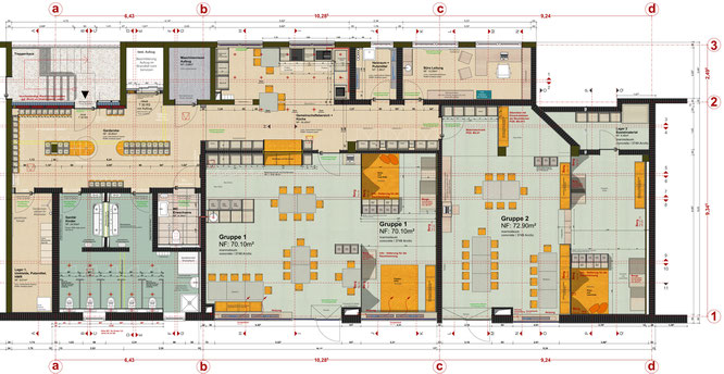 Die Garderoben und die WC-Anlagen wurden entlang der Erschließungszone platziert, um kurze Wege zu gewährleisten und die Hauptspielbereiche zu entlasten. Die Küche liegt nun optimal angebunden. Wesentlich ist die "fließende Übergangszone" zum Außenbereich, die den Kindern den direkten Gartenzugang erleichtert. Die klare Zonierung von Funktions- und Spielbereichen schafft Ordnung und Übersicht für den pädagogischen Alltag