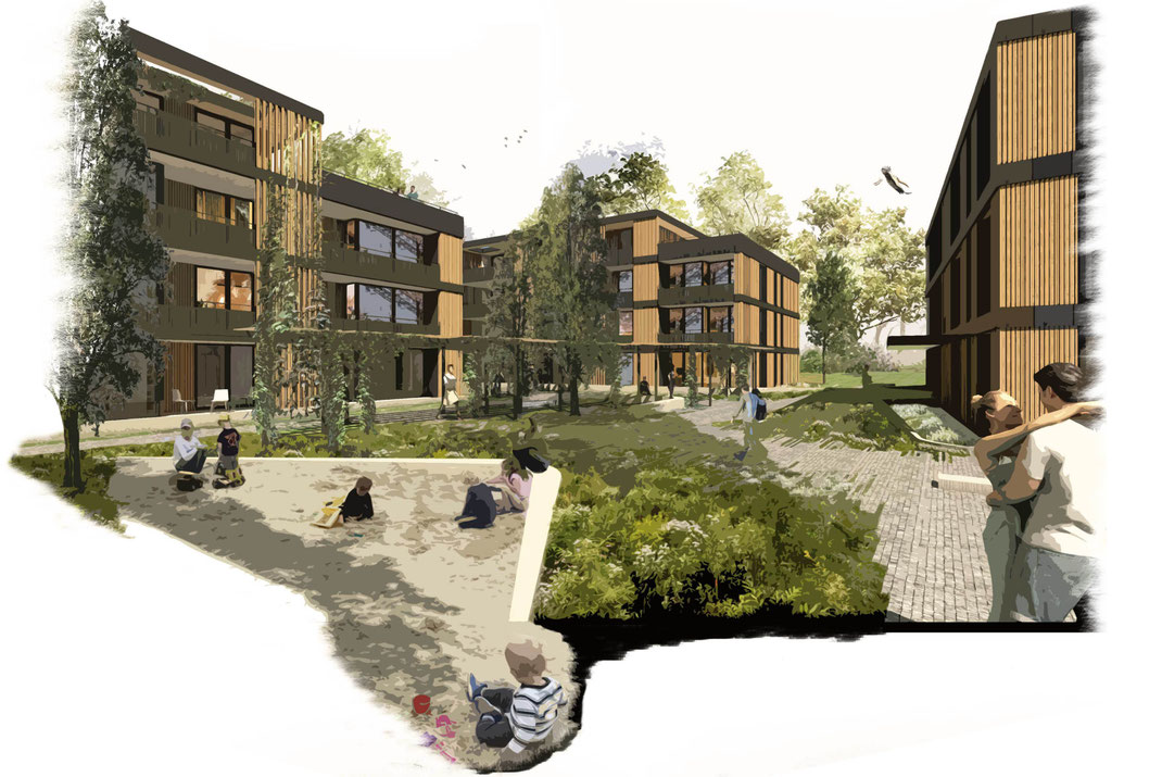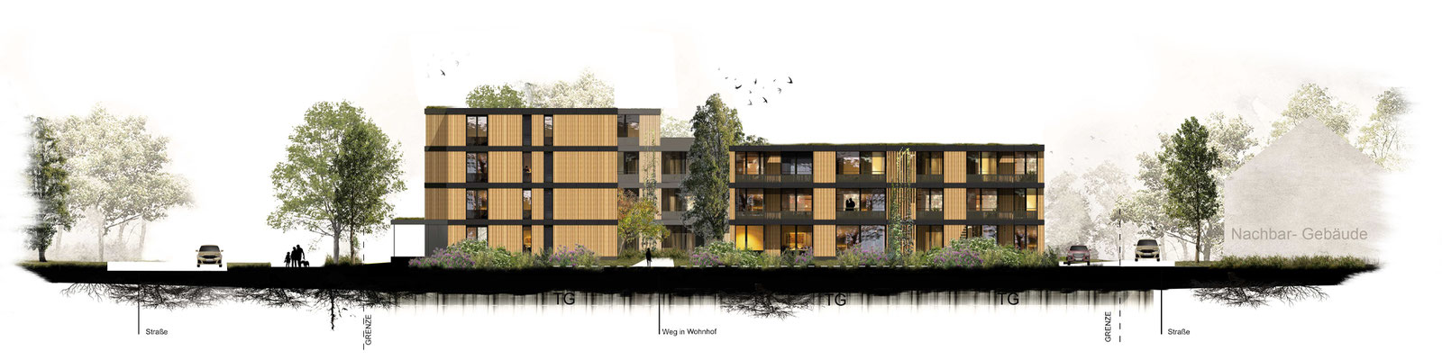 Ein besonderer Fokus liegt auf der Förderung des Miteinanders. Das Herzstück bildet der gemeinschaftliche Innenhof, der als Treffpunkt, Spielbereich und grünes Wohnzimmer dient. [HIER KONKRETES DETAIL EINFÜGEN, z.B.: Eine gemeinschaftliche Dachterrasse mit Hochbeeten oder ein Gemeinschaftsraum im Erdgeschoss] ergänzt dieses Konzept und bietet Raum für Feste, Austausch und nachbarschaftliche Hilfe.